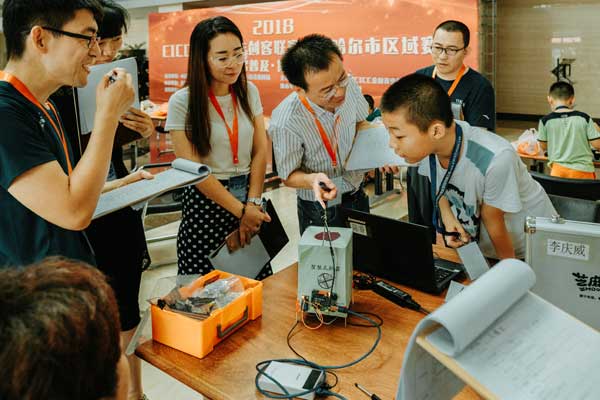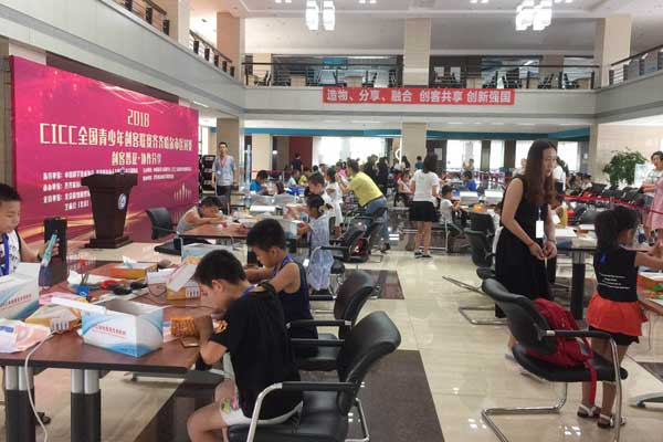 在做好上述工作的同时,还要积极为学院各项大型活动做好服务工作。最近,图书馆协办了第二届CICC全国青少年创客联赛齐齐哈尔市区域赛,全市中小学生代表们带着他们的避障小车、绝地救援液压机械臂、3D打印制作以及各种创客编程作品走进图书馆,图书馆大厅成了小创客的大型智慧工厂。这期间,图书馆员们更加忙碌了,起早贪黑为比赛准备场地,事无巨细地安排好各项管理工作,看到孩子们出色的表现,图书馆员们露出了欣慰的笑容。