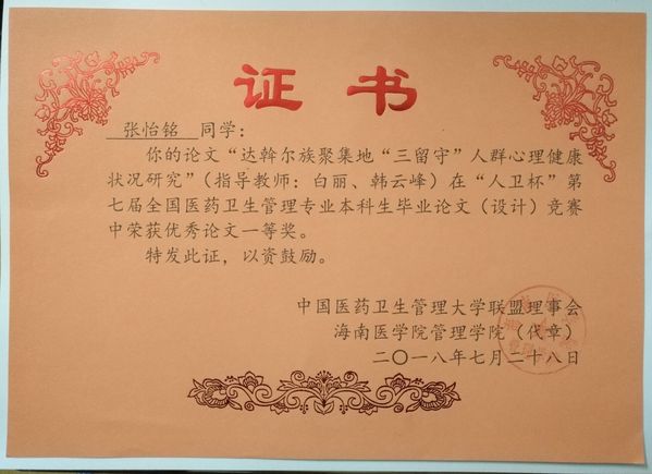 7月27日-30日,由中国医药卫生管理大学联盟理事会主办的第十四届中国医药卫生管理学院(系)院长(主任)论坛暨第七届“人卫杯”中国医药卫生管理专业本科毕业论文(设计)大赛颁奖仪式在海南博鳌举行。此次竞赛全国共有41所高校参与,推荐竞赛论文119篇,设一等奖10个、二等奖20个、三等奖30个。公共卫生学院张怡銘同学的论文《达斡尔族聚集地“三留守”人群心理健康状况研究》(指导教师:白丽教授、韩云峰副教授)在本次竞赛中首次荣获优秀论文一等奖。