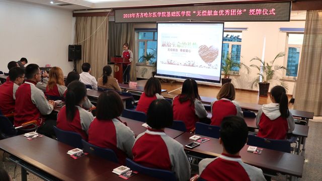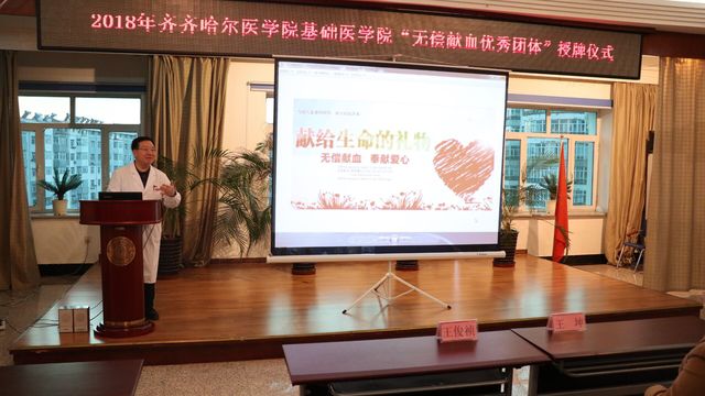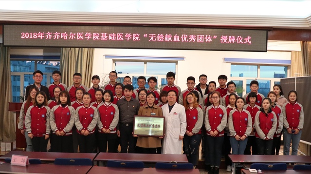 齐齐哈尔红十字中心血站为表彰齐齐哈尔医学院基础医学院近年来对无偿献血事业的支持,于2018年11月8日在血站会议室举办齐齐哈尔医学院基础医学院无偿献血优秀团体授牌仪式。齐齐哈尔红十字中心血站党总支副书记、副站长王俊祯同志、基础医学院团委书记、辅导办主任王坤及基础医学院37名学生代表参加此次仪式,仪式由血站血源科科长张旭主持。
