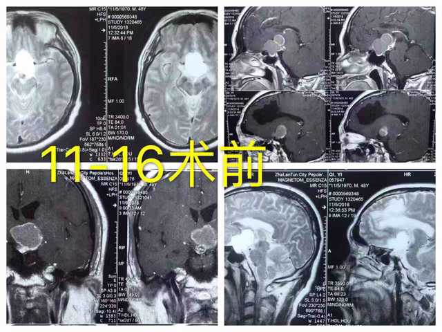 患者齐先生,内蒙古莫旗人,一年前出现左眼视力下降,未予重视,当时无明显头痛症状,无肢体功能障碍,近20天患者突发出现双眼视力下降,进行性加重,现仅有眼前光感,且伴有头痛症状,曾于某医院就医行头CT检查显示:鞍区占位病变,病情持续性加重,经过多方诊治无好转,后慕名转至我院入住神经外二科。经过科室讨论诊断为囊性颅咽管瘤,需要手术治疗。传统手术为开颅翼点入路,手术时间约5小时,但家属拒绝开颅手术,经神经外二科、CT、麻醉科与手术室多科讨论,拟采用CT引导下囊性颅咽管瘤穿刺储液囊植入术。