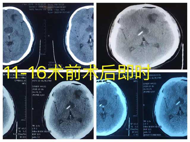 在多科室协助下,手术顺利进行,患者局麻下头皮切口约2cm,颅骨钻孔后,在CT实时引导下将储液囊头端刺入约7.5cm进入瘤腔内,回抽出约5ml囊液,连接储液囊,并植入头皮下,逐层缝合头皮各层,手术过程仅仅20分钟,术后患者神清语明无肢体活动障碍,粗测视力已恢复,返回病房。