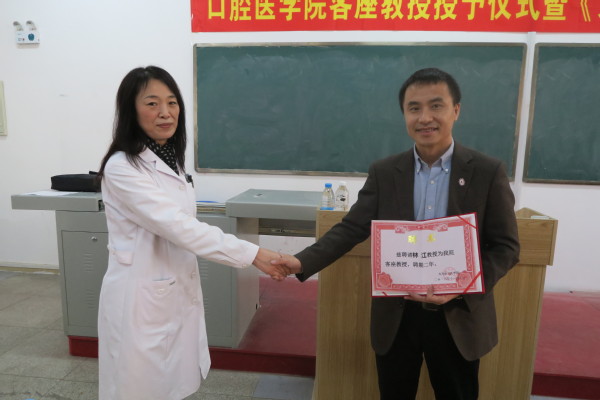 口腔医学院党总支书记李晓华为林江教授颁发客座教授聘书