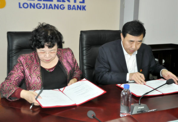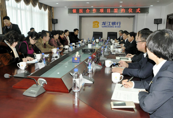 12月10日下午,院长张淑英、副院长赵玉环携院办、网络信息中心、财务科、宣传科等相关人员一行11人,赴龙江银行齐齐哈尔分行进行银医合作项目签约。龙江银行分行行长王建臣、副行长梁起斌、建兴支行行长张冬欣等领导进行了热情接待。双方在龙江银行7楼会议室举行了项目签约仪式,梁起斌副行长主持见面签约会。