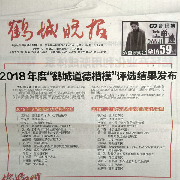 为培育和践行社会主义核心价值观,提高公民思想道德素质和社会文明程度,充分发挥道德楷模的示范引领作用,营造崇德向善、见贤思齐、德行天下的浓厚氛围,市文明办在全市深入开展“我推荐我评议身边好人”活动的基础上,广泛开展了2018年度“鹤城道德楷模”评选活动,经过基层推荐,分层评选,评选出2018年度“鹤城道德楷模”15人,提名奖15人。周扬以其感人的事迹和勇于担当的精神赢得了社会各界的认可和好评,光荣当选了2018年度“鹤城道德楷模”。