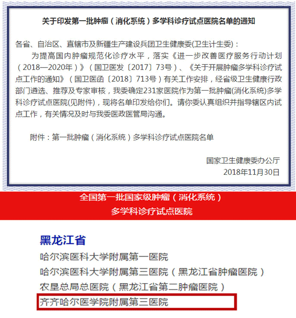 11月30日,国家卫生健康委办公厅公布了第一批肿瘤(消化系统)多学科诊疗试点医院名单,确定全国231家医院作为第一批肿瘤(消化系统)多学科诊疗试点医院,其中黑龙江省有4家医院入选,附属第三医院是齐市唯一一家入选医院。