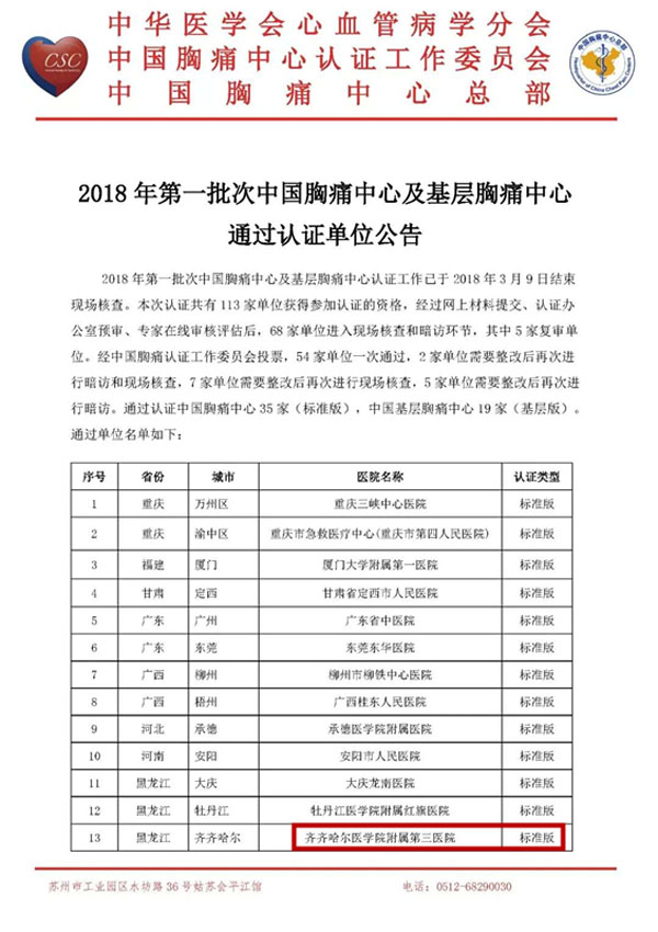 3月22日,中国胸痛中心总部发布了《2018年第一批次中国胸痛中心及基层胸痛中心通过认证单位公告》,齐齐哈尔医学院附属第三医院胸痛中心通过中国胸痛中心总部的认证。附属第三医院胸痛中心将为本地区胸痛患者架起救治成功的“高速路”,开通与死神争夺生命的“绿色通道”。