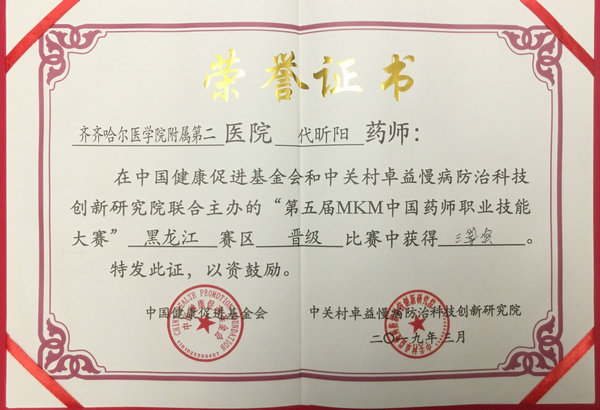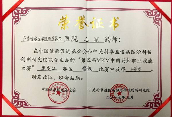 本次大赛是由中国健康促进基金会、中关村卓益慢病防治科技创新研究院联合发起,并由黑龙江省药学会承办,48家医疗机构报名参赛,通过线上选拔24家医院晋级复赛。大赛分为理论题和口述题两个部分,我院毛颖、代昕阳两位选手积极备考、准备充分、沉着应战,最终荣获得了三等奖。