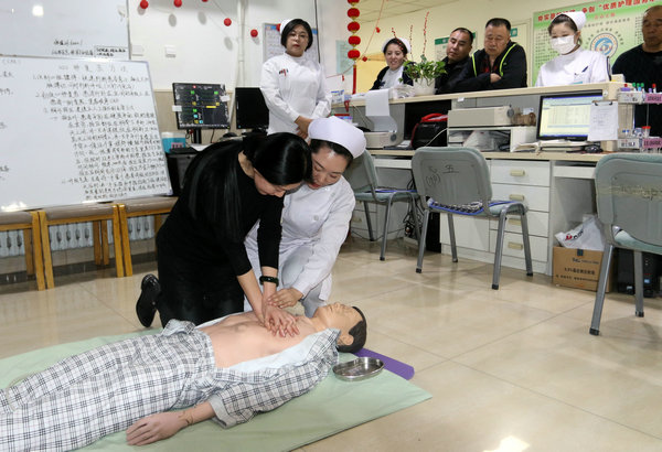 心内科五病区主任梁波(右一)介绍心肺复苏的重要性