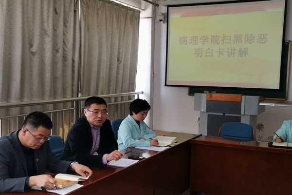 会议第二项,李春旭院长带领与会人员对齐齐哈尔医学院扫黑除恶明白卡进行了深入解读。他指出病理学院全体教职员工要以习近平总书记关于扫黑除恶专项斗争的重要指示精神和全国两会精神为指导思想,深入贯彻学习全省教育系统扫黑除恶专项斗争工作基本原则,以呼吁学生远离非法“校园贷”及电信诈骗、远离非法宗教邪教活动、严防校园欺凌等方面为工作重点,切实维护学生生命财产安全。