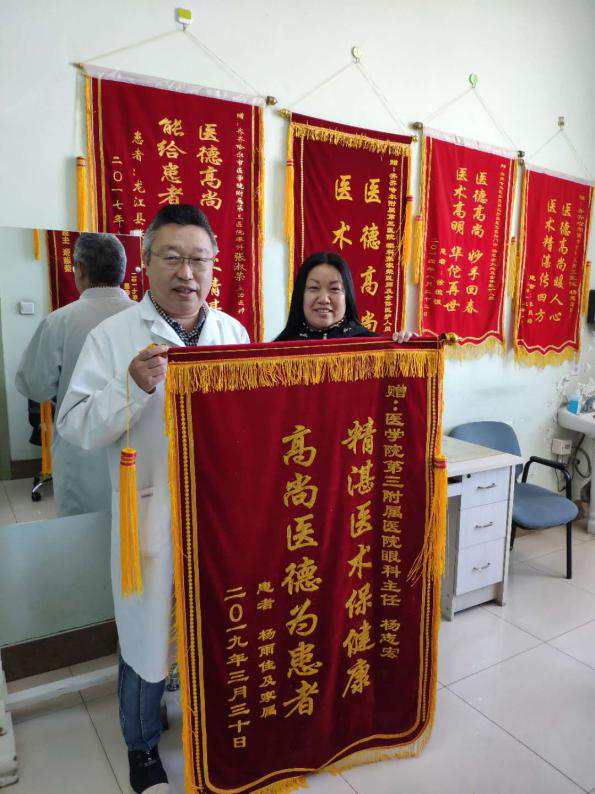 4月2日上午,我院康复患者杨雨佳的家属来到眼科门诊,感激地说“感谢杨大夫真心为患者,孩子才恢复的这么好!”并代表一家人送来了“精湛医术保健康,高尚医德为患者”的锦旗。