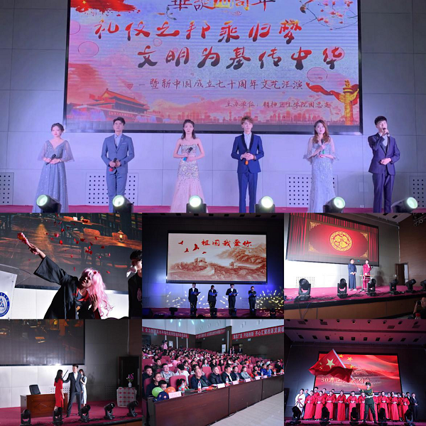 晚会伴随着激情的开场舞以及一段中国由衰弱走向富强的视频缓缓拉开帷幕。诗朗诵《祖国,我爱你》以及独具特色的方言朗诵《祝酒歌》,以铿锵有力的声音,表现出了来自祖国各地的齐医学子对伟大祖国深深的祝福和浓浓的爱意;古筝、琵琶二重奏《战台风》,使观众们领略了中华传统乐器的魅力;话剧《末代皇帝》以没落的封建王朝为背景,将历史长河中的恩恩怨怨表现的淋漓尽致;绘声绘色的相声、小品,热情奔放的舞蹈展现了当代大学生的阳光活力;祖国七十年的沧桑巨变、七十年的民族复兴伟业在歌曲《映山红》、《祖国之恋》中得以诠释;独具特色的经典诵读《家国之声》,从先秦直至新中国成立的历史长河中,截取了各个时代的经典爱国诗词进行了诵读和表演,让师生们感受到了炎黄子孙自古以来的爱国情怀。
