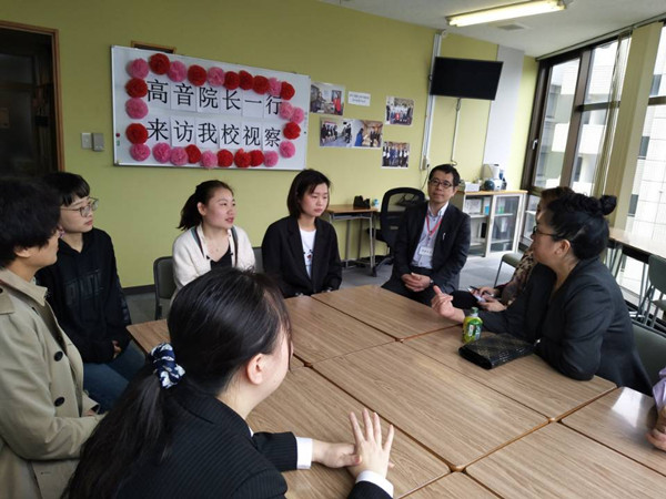 代表团一行还访问了日本松户国际学院,期间双方就赴日学生语言学习的方法、学习中遇到的困难及如何进行语言培训等内容进行了探讨。代表团一行每到一处都看望了当地学习和工作的我院学生并与他们进行了座谈。