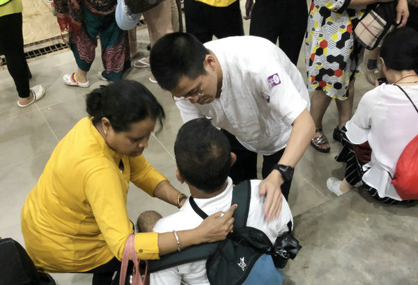 那是4月23日17时,姜医生陪着爱人一同在泰国芭提雅东芭乐园游玩,在观看大象表演过程中,一名印度游客突然倒地,随身物品摔落一地,此时,站在离这名印度游客不远处的姜海瑞医生出于职业的敏感,马上意识到该游客可能发生了猝死,于是他几个箭步飞奔到了倒地游客的面前,迅速检查了游客的生命体征:意识丧失,颈动脉搏动消失,双侧瞳孔散大,面色青紫。根据病人的情况,迅速心肺复苏是确保印度游客得以生存的关键,情况紧急,由于语言不通,游客家属和队友都吓坏了,长大了嘴巴,不知所措,只有一双双带着关切和疑虑的眼睛盯着姜医生,姜医生这时一边跪在地上为印度游客进行心肺复苏,一边呼救同行人拨打求救电话,站在姜医生旁边的爱人这时用英文告诉家属:He is doctor,from china!约5分钟左右印度游客开始恢复了意识,这时候景区急救员也赶到了现场,姜医生的爱人用英文协助他询问印度游客的症状,得知患者有心脏病史,正好这几天泰国天气炎热,加之旅游过程中舟车劳顿,所以发生了开头的惊魂一幕。