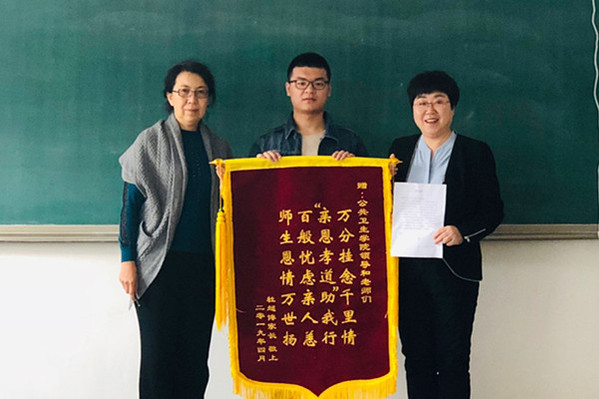 2019年4月24日,16预防2班的杜超博同学怀着无限感激的心情向公共卫生学院的领导和老师们敬献上了写有“万分挂念千里情亲恩孝道助我行百般忧虑亲人恙师生恩情万世扬”的锦旗,张长娟书记、娄峰阁副书记、梁玉清主任热情拥抱了杜超博并对他感恩学校、感恩老师的行动给予充分肯定。