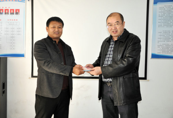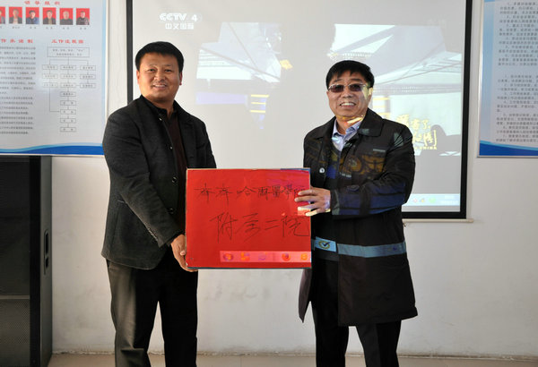 学院党委书记顾长虹(右)代表学院及医院党委为长发村赠药