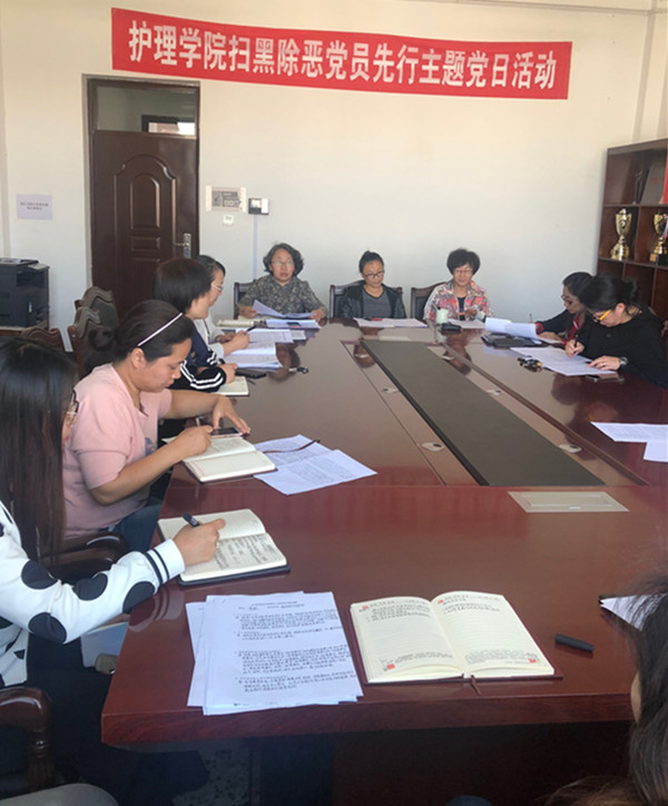为全面贯彻落实国家扫黑除恶专项斗争的工作部署,按照学校《关于开展“扫黑除恶党员先行”主题党日活动的通知》要求,2019年5月29日上午,护理学院党总支在部系楼B区510会议室举行了“扫黑除恶党员先行”主题党日活动。活动由学院党总支书记厉红主持,并为全体党员教师分别从习近平总书记关于扫黑除恶专项斗争系列重要指示批示以及中央和省市委扫黑除恶工作部署有关精神的背景、内容、意义等进行了认真的解读。