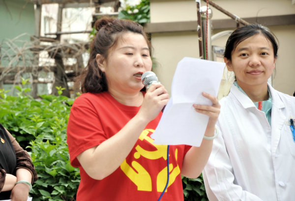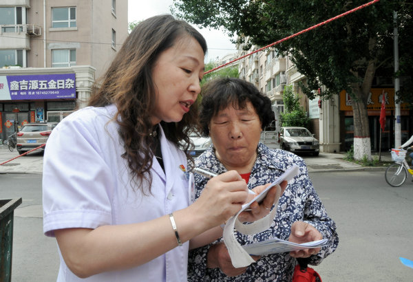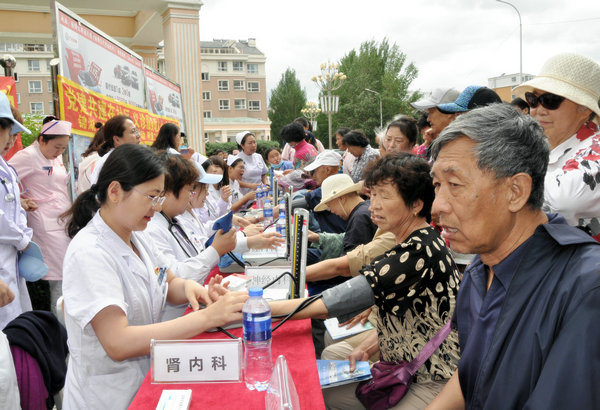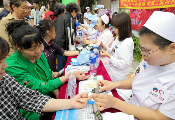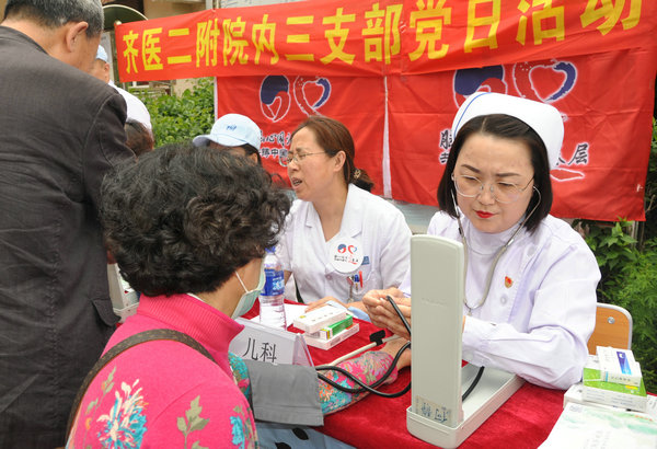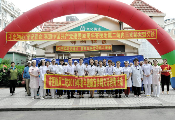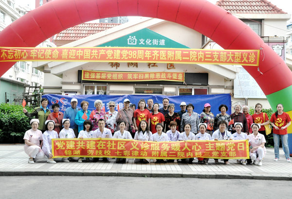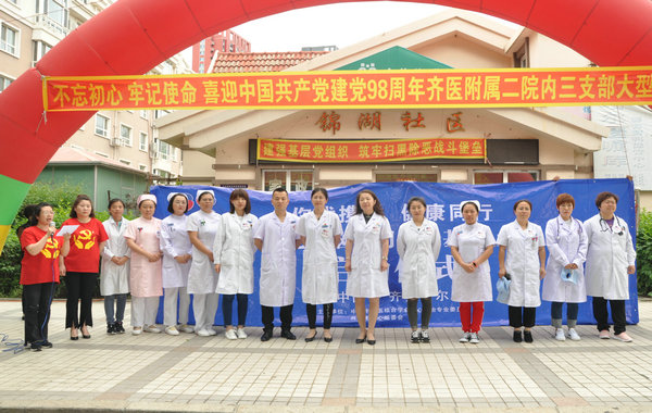 6月14日下午,内三党支部与锦湖社区党委固定党日在锦湖社区联合举办了“老年健康宣传周”暨“不忘初心 牢记使命”大型健康扶贫义诊宣传活动。内三党支部书记、市健康教育协会糖尿病专业主委、内分泌科兼营养科主任张健教授、锦湖社区党委书记吴金华、宣传科科长高秀文分别致辞,锦湖社区党委副书记马云浩主持启动仪式。儿科主任朱颖、肾内科副主任张艳等17名党员,携带听诊器、血压计、血糖仪、心电图机等诊疗设备和健康宣传手册,为200余名社区居民进行了义诊宣传。
