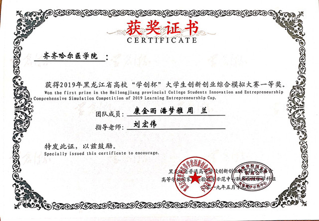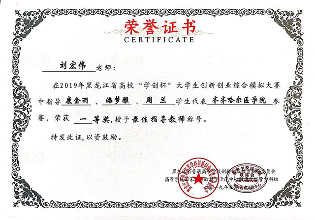 近日,第六届黑龙江省高校“学创杯”大学生创新创业综合模拟大赛在哈尔滨理工大学圆满落幕。经过激烈的比拼,基础医学院2016级临床医学13班康金雨、藩梦雅、周兰组成的“超航代表队”荣获大赛一等奖,指导教师刘宏伟获得“最佳指导教师”称号。本次参赛是自2017年基础医学院代表学院参赛以来的历史最好成绩,获奖团队将于今年10月代表学院参加国赛奖项的争夺。
