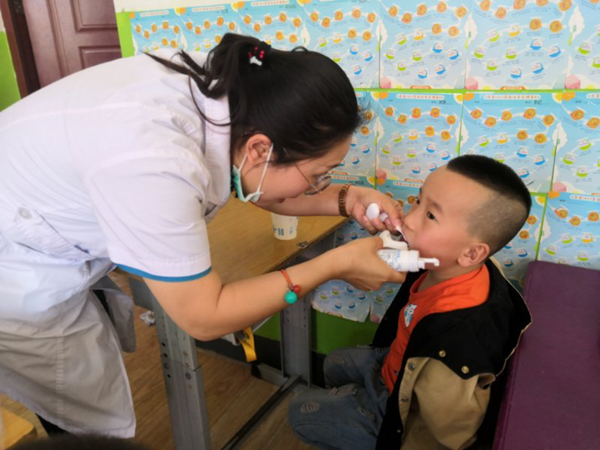 口腔科医生为幼儿做牙齿涂氟治疗