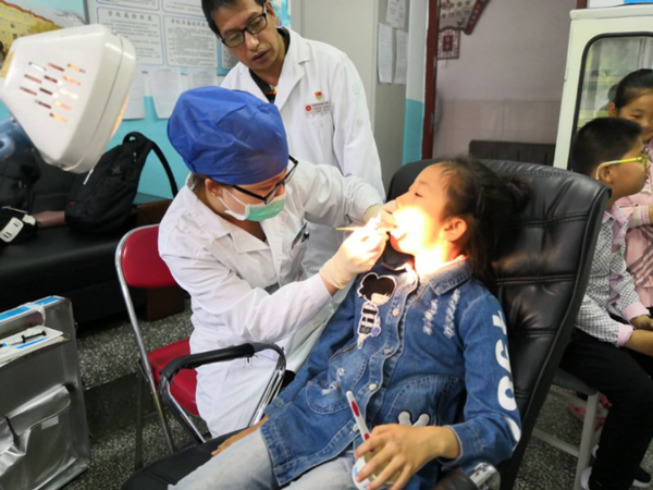 口腔科医生在为小学生做窝沟封闭治疗