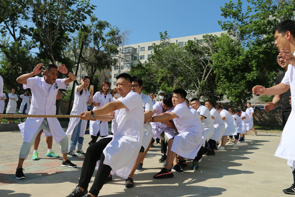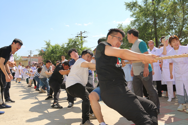 每个分会派出15名职工参赛以外,其他的职工都主动组成拉拉队,为在场的队员加油。不仅如此,比赛结束的职工立刻主动去给正在比赛的队伍加油助威,比赛场面既激烈又温馨。比赛的队员都全力以赴:每个参赛队伍由10男5女组成,比赛中队员们使出自己浑身力气奋力将绳子拉往自己的方向,看看他们涨得通红的脸,额头突出的青筋,就知道他们有多么努力了。经过激烈的比拼,最终医技分会获得冠军,外科分会屈居第二名,内科分会获得第三名。
