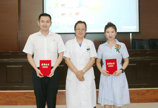 门诊部主任魏横波、护理部主任孙晶、工会副主席韩秀丽为三等奖选手颁奖