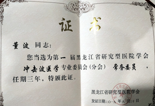 6月30日,由黑龙江省研究型医院学会主办、哈尔滨市第一医院承办的“黑龙江省研究型医院学会冲击波医学专业委员会成立大会暨首届学术年会”在哈尔滨市第一医院召开,医院泌尿外科一病区副主任董波应邀参加大会,当选为常务委员。