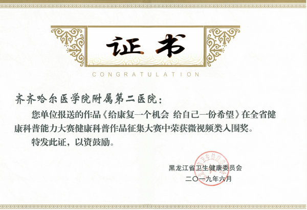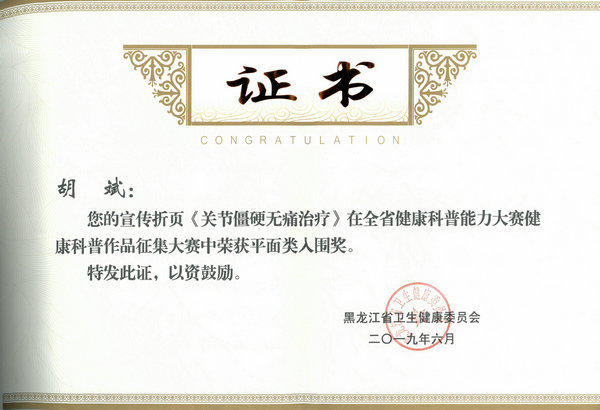 近日,全省健康科普能力大赛健康科普作品征集大赛圆满落下帷幕,医院积极组织参赛,取得了优异成绩。康复医学科报送作品《给康复一个机会,给自己一份希望》荣获微视频类入围奖,胡斌创作的宣传折页《关节僵硬无痛治疗》、张宇制作PPT课件《TMD也是病?》分别荣获平面类入围奖,高秀文荣获最佳参与奖。