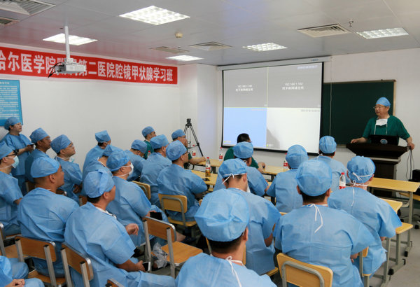 开班仪式上,张浩民主任发表了热情洋溢的致辞。他指出,为了更好推进齐市地区乃至我省腔镜甲状腺事业的发展,由哈医大四院主办、齐医附属二院承办联合举办了腔镜甲状腺手术学习班,为从事普外科学临床诊疗的广大医学同仁提供了良好学习、交流、提高的平台与机会,为维护和促进齐市地区医疗卫生事业发展和百姓健康做出了积极贡献。此次学习班的胜利召开,得到了各兄弟单位和新闻媒体的大力支持,使腔镜甲状腺诊疗新方法得到了广泛传播和推广,为维护和促进广大百姓的身心健康起到了助推作用。张主任还为全体学员介绍了附属二院的发展历程和普外科的发展现状,通过真挚交流与学员们结下了深厚友谊,搭建起了一座互通有无、共同进步的连心桥。
