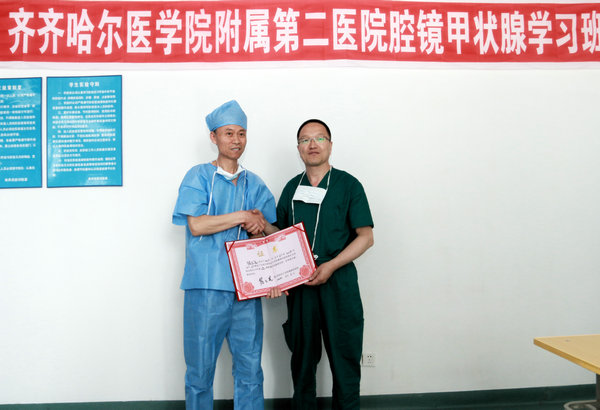 开班仪式结束,哈医大四院陈之显团队和我院张浩民团队分别进行了《腔镜下甲状腺腺叶切除的方法—王氏七步法》《齐医附属二院普外科腔镜发展》专题介绍,并开展了两台经胸乳入路腔镜下甲状腺癌根治术和一台腹腔镜下胃间质瘤手术现场实际手术演示。手术期间,学员们通过我院手术观摩室里的直播系统和现场观摩形式学习观看手术过程,倾听导师讲解和指导。导师们的精湛技术和深厚的医学理论知识赢得了全体学员的充分认可和好评。学习结束,陈之显教授等为学员颁发了培训证书,张浩民教授等接受了市新闻媒体的专访。