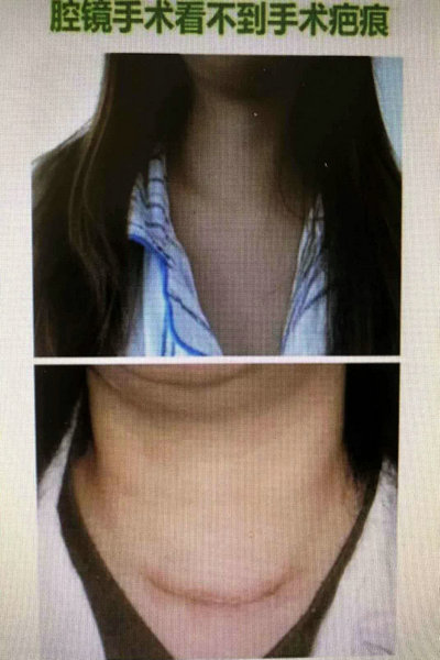 6、颈部无疤痕:颈部不切开,在胸壁或腋窝、口腔等部位切开,切口小而隐蔽。