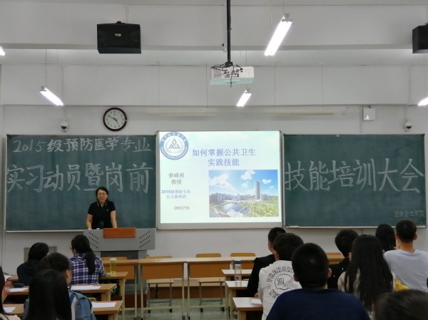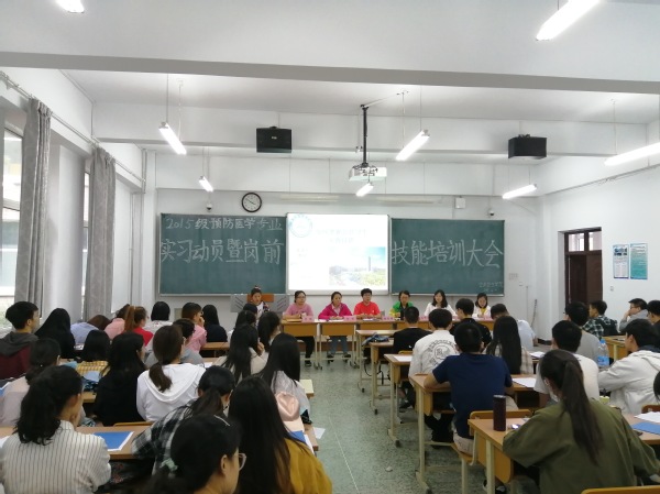 为加强毕业生实习管理,确保毕业实习和毕业论文专题实践工作的顺利进行。2019年7月5日,公共卫生学院在部系楼A-B101教室召开2015级预防医学专业毕业实习动员会暨实习岗前技能培训会。学院党总支书记张长娟、副书记娄峰阁、副院长白丽、辅导办主任梁玉清、辅导员李博和李晓璇、教研科陈明琪和2015级预防医学专业全体同学参加了本次会议。会议由辅导办主任梁玉清主持。