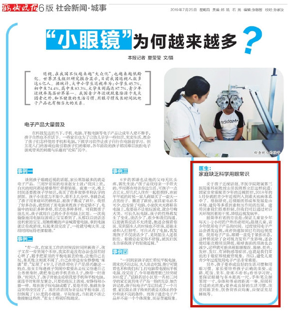 7月25日《鹤城晚报》第6版刊发报道了对我院眼科主任邢立臣关于近视发病原因及近视低龄化的防控措施的采访