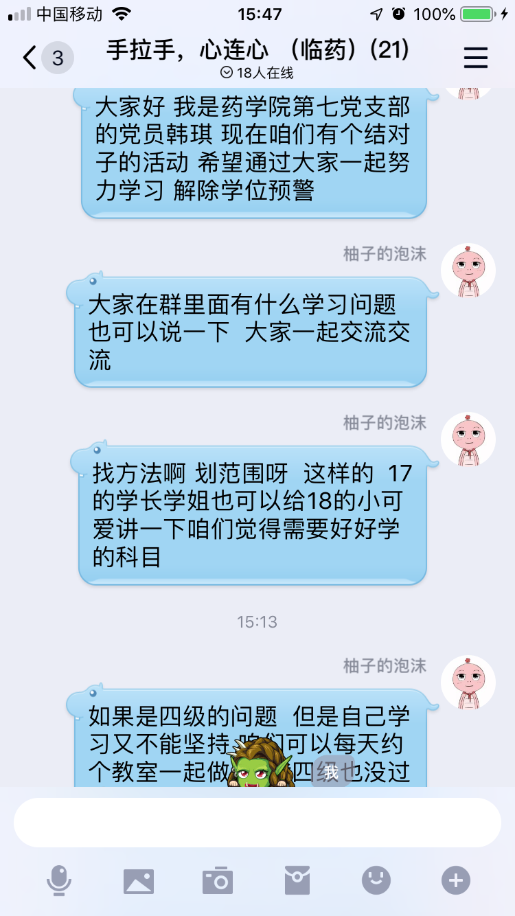 2019年10月12日,学院党委第七党支部学生党员通过QQ通讯平台,对学院大一到大三所有学业预警同学有关学习方面的疑惑和问题给与解答,并与之建立起长期协助关系。