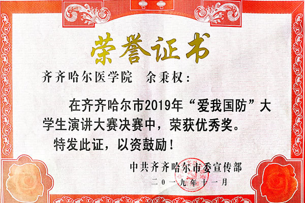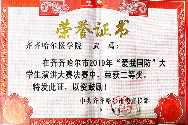 近日,由中共齐齐哈尔市委宣传部、市委教工委、齐齐哈尔军分区、市退役军人事务局联合举办的“爱我国防”大学生演讲比赛决赛在65447部队大礼堂举行。学院选派的病理学院武禹同学荣获二等奖,基础医学院于秉权同学荣获优秀奖。