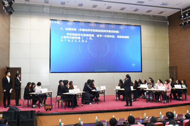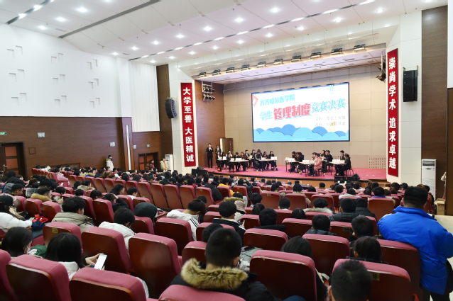 为进一步促进学风建设,使学生深入了解校规校纪,树立良好的学习行为规范,更好的适应大学生活,由学生工作部主办,口腔医学院承办的齐齐哈尔医学院学生管理制度竞赛决赛于12月4日在多功能厅举办。学生工作部、招生就业处、团委等部门相关人员、各二级学院书记、副书记及全体辅导员出席本次活动,各二级学院学生观众代表共300余名观看了比赛。