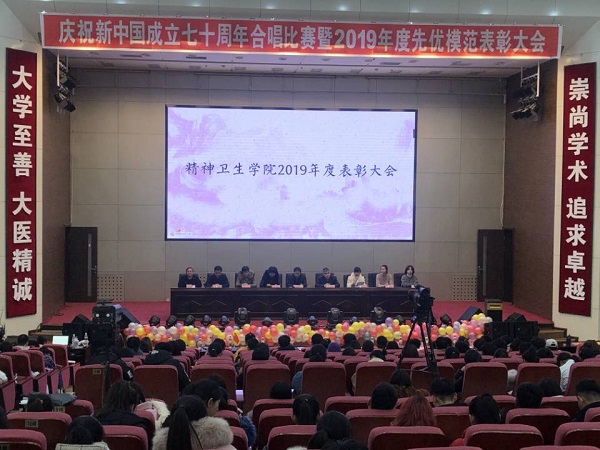 为增强班级凝聚力,营造优良学风班风,精神卫生学院于12月1日在图书行政楼二楼多功能厅隆重举办了以“不忘初心跟党走、青春拥抱新时代”为主题的庆祝新中国成立70周年合唱比赛暨2019年度先优模范表彰大会。精神卫生学院党总支书记史孝志、院长王玉花、副书记赵阿勐、副院长李平、副院长李丽波,全体辅导员、班主任及2019级新生等300余人参加了此次活动。