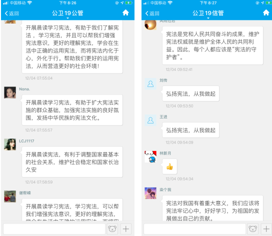 此次活动以宪法演讲比赛、宪法晨读和易班热议的形式开展。9月25日,组织2019级各班同学开展了宪法演讲比赛,参赛选手紧紧围绕“学习宪法 遵纪守法”这一主题展开演讲,阐述了自己对宪法的理解,表达了对宪法的崇高敬意。“国家宪法日”当天组织全院15个班级开展宪法晨读,选择《中华人民共和国宪法》部分内容作为诵读材料,同时通过易班组织学生对“学习宪法 遵纪守法”开展热议,让学生了解宪法的基本知识,引导并促进学生学习宪法知识、增强法治意识、弘扬宪法精神。