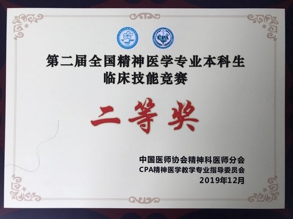 12月6日,第二届全国精神医学专业本科生临床技能大赛全国总决赛在湖南长沙中南大学湘雅二医院举行,精神卫生学院2015级精神医学专业周婷璇和董春丽两位同学获得了本次大赛的二等奖。比赛内容包括精神科专业技能和临床基本技能操作。其中,精神科专业技能包括精神疾病患者的病史采集、精神状况检查、诊断、治疗策略和医患沟通,占60%;临床基本技能操作包括心肺复苏、腰穿和神经系统检查,占40%。来自中南大学湘雅医学院、哈尔滨医科大学、新乡医学院、蚌埠医学院等多家单位进行了全国总决赛的角逐。精神卫生学院王玉花院长作为中国精神科医师协会精神医学教学指导委员会副主任委员参与了此次大赛的评审。本次技能大赛充分展示了全国各高校精神医学专业教学的丰硕成果,激发了学生对专业实践技能的学习热情。
