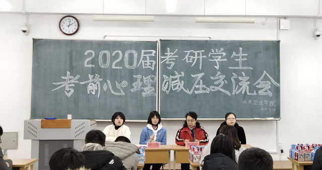 2020全国硕士研究生招生考试已进入倒计时,为帮助2020届考研学生缓解考前压力, 12月16日,公共卫生学院召开“2020届考研学生考前心理减压交流会”,党总支副书记娄峰阁、辅导办全体教师及2020届考研学生参会。