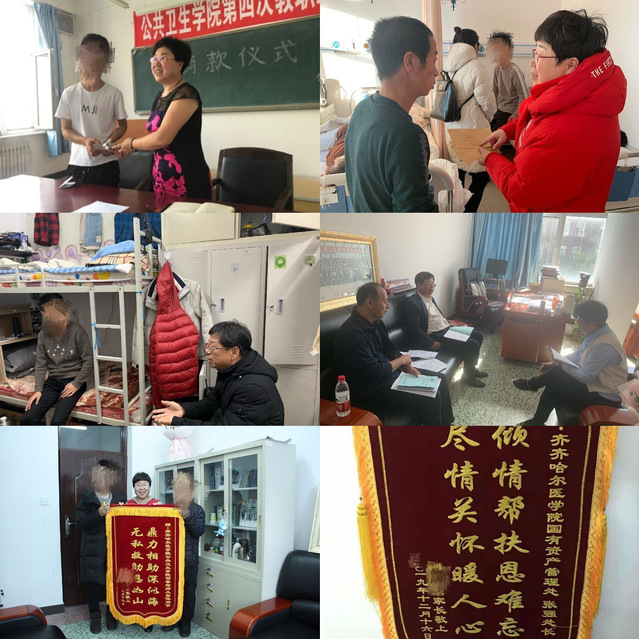 这名同学2016年寒假他生病住院治疗,花费十余万元,手术期间班主任贾月辉老师到医院看望陪护,联系医生。自2017年治疗至今病情并未痊愈,经多次复查病因仍不明朗,尤其是出院后医保仅可报销1万元,对于这个母子生病、负债累累的家庭更是如雪上加霜。得知这一情况后2017年7月公共卫生学院组织全院师生向其捐款10977元,2018-2019学年先后为其申请学院临时困难补助2次共计4000元。治疗期间,学生心理压力很大,公共卫生学院老师第一时间及时开导,帮助减轻压力。国资处按照《齐齐哈尔医学院领导干部深入基层联系学生实施方案》的要求,与公共卫生学院对接,多次一起研究怎样开展帮扶工作。2019年11月在“不忘初心、牢记使命”主题教育之时,这名同学再次发病需要住院,在了解了相关情况后,张强处长多次向学生家所在地的地方政府进行政策咨询、询问建档立卡等事宜,在本地来回奔走为其联系门诊并安排其入院治疗;与医生商议慢病鉴定与医保报销等事宜,还与公共卫生学院老师一起深入寝室看望并开导学生;2019年12月公共卫生学院师生去医院看望,为这名同学捐款4320元,国资处处长张强个人捐款1000元,经过第三附属医院血管外科李喜春主任的精心治疗,现在学生已经出院,参加期末考试。