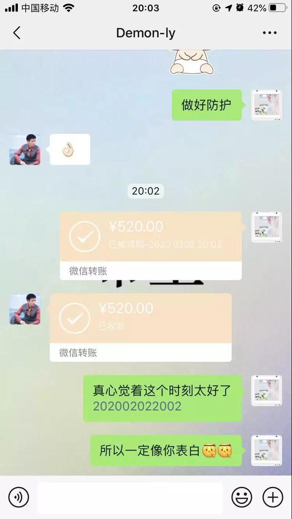 20:02,媳妇儿给发了一个520的红包。202002022002,520,这样的一串数字,很难得,我也很默契的立马截图。记录人生美好的时刻,不是因为时间,是那个时间刚好遇见你,是因为有你的每一刻都是那么美好。