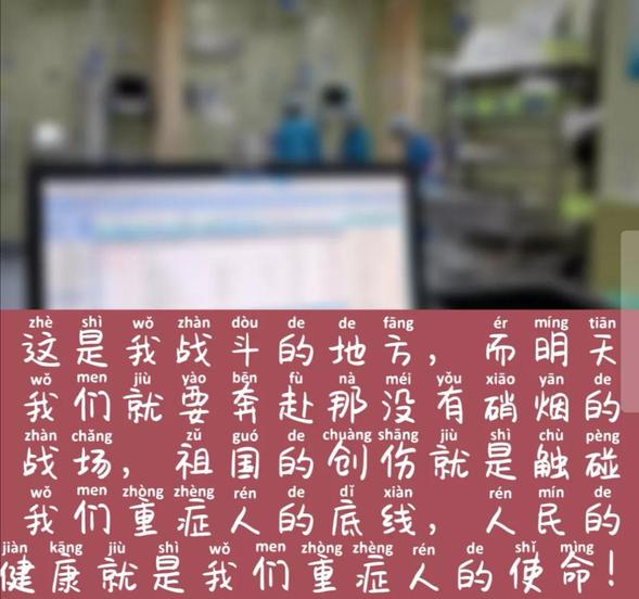 2月5日,今天是我第一次正式进入ICU隔离病区工作。吃早餐的时候,翻看着朋友圈,有一则新闻,标题是:火神山医院10天竣工,背后藏着许多你不知道的事。“哪有什么中国奇迹,不过是一群善良执着的普通劳动者,用命在拼;哪有什么百毒不侵,不过是一群普通的医务工作者在逆向而行;哪有什么岁月静好,不过是有人在替你负重前行。”是的,我们的身边,有无数的“普通人”,他们践行着自己的职责,履行着自己的诺言,守护着我们的平安,他们来自56个民族,是彼此的后背,他们的名字叫“中国人”。