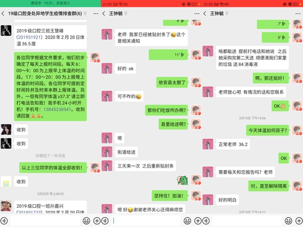 对身处异地的学生进行单独管理,每日上报体温两次。对处在隔离期的同学一对一沟通了解其生活情况,并确保身体健康。