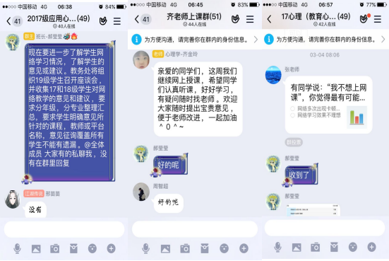 4.与学生的沟通。通过各班级QQ群可以随时与学生取得联系,提前发布上课通知,学生可对授课情况、各种教学平台授课效果和网络运行情况进行及时的反馈和建议。