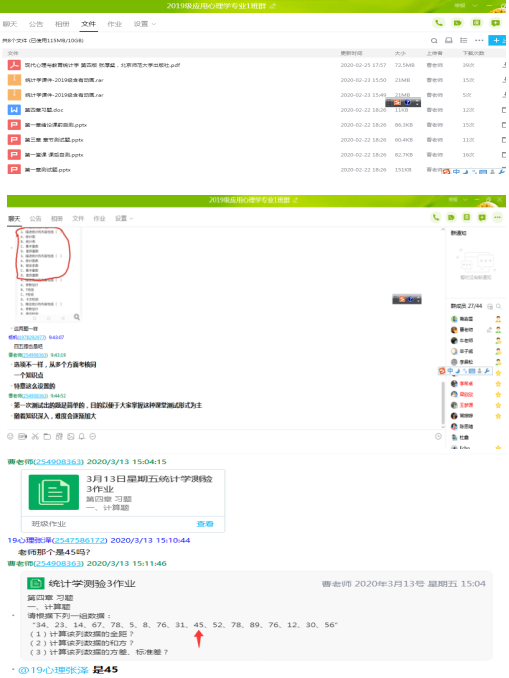 疫情防控期间,在学校党委和各级领导的统一部署和指导下,精神卫生学院的线上教学工作平稳有序进行。在线教学不仅是疫情期间的应急手段,同时也是疫情过后解决实体课堂教学矛盾的重要手段。因此,我院全体教师对此次线上教学的开展高度重视。“开学”前,为了进行了充分的教学准备,老师们牺牲了春节和寒假的休息时间,积极参与多家网络教学平台组织的培训,最终根据学生专业和课程特点,一课一策,选用了最适合各自课程的授课平台,如超星(学习通)、爱课程(中国大学MOOC)、腾讯视频会议、QQ群直播等。其中采用最多的是QQ群直播授课。如《心理咨询与治疗技能训练》、《社会心理学》、《心理统计与SPSS数据处理》、《社会学研究方法》等,共有14门课程在该平台直播授课。以下与大家分享我院教师在该平台进行网络授课的一点经验和体会。