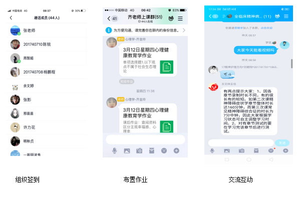 除此之外,教师们利用各种方式与学生进行课前、课上、课后的交流,通过发布公告、布置学习任务、签到、数据监控、作业批改、发起讨论、线上测试、组织调查问卷等方式与学生积极互动。以此及时了解学生们对课程的接受程度、学习成效,有针对地调整和改进授课重点、讲授方式,实现了在线教育技术与教育教学过程的融合与贯通。