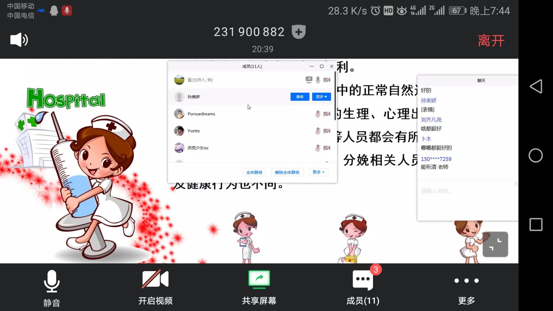 为了保证在线直播的顺利进行,教师提前半小时开通直播测试直播效果,以便出现卡顿不能正常直播能及时采取应急预案。线上直播教学应用腾讯会议平台,直播过程中网络顺畅,画面清晰、语言流畅,学生在讨论区参与讨论的积极性很高。(图4、5)直播教学为了检查学生听课状态,随机点名提问,学生可以自行打开麦克语音回答,学生回答后教师可以给予禁言。课中根据讲授内容进行小讨论,学生以文字的形式回答,以便学生及时表达自己的问题和想法,进行师生互动、生生互动,互助互学。(图6)