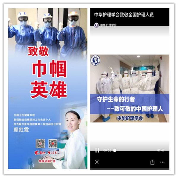 课间休息时播放学习强国中“守护的光”、“也等樱花开”、“为了谁”这样具有时代特征而且励志的歌曲和中华护理学会抗击疫情的宣传片,让学生享受美妙音乐休息的同时,感受护理职业的崇高与伟大。(图8)