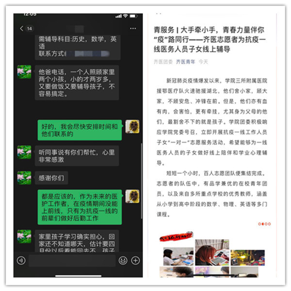 疫情当前,许多身为父母的医务工作者投入一线,守护人民群众的生命健康。很长一段时间里,他们不能回家照顾家人、陪伴孩子学习,难免忧心和挂念。护理学院上一届学生会主席梁迪同学参加了齐医线上活动“大手牵小手,青春伴你疫路同行”,在线为抗疫一线医务人员子女辅导功课。张越同学也在公众号里参加了免费线上智能课堂,并为报名的孩子建立线上的微信群,每天有志愿者管理,志愿者线上一对一辅导上课,让孩子们不因疫情而影响学业。同时,张越还参加了30多人的“疫情防控突击队”,根据疫情需要,随时安排人员出击。